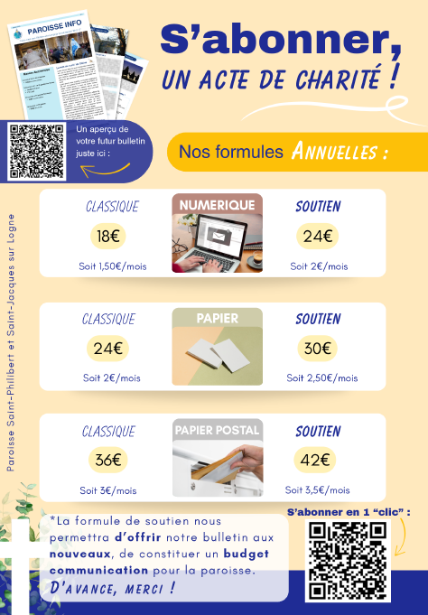 La formule soutien permettra notamment de constituer un budget dédié à la communication paroissiale. Grâce à elle, nous pourrons mieux informer chacun, offrir des exemplaires aux nouveaux arrivants pour leur présenter la paroisse et faire rayonner autour de nous la Bonne Nouvelle !